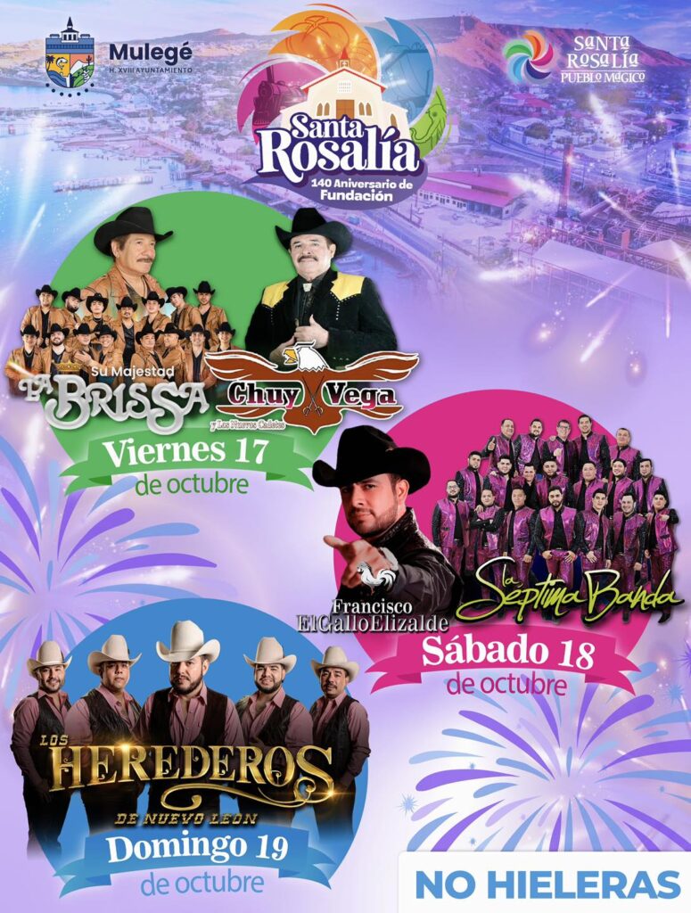 Santa Rosalía, B.C.S.– El H. XVIII Ayuntamiento de Mulegé, que encabeza la presidenta municipal Edith Aguilar Villavicencio, invita a la ciudadanía a participar en las actividades conmemorativas del 140 Aniversario de la Fundación de Santa Rosalía, las cuales darán inicio este jueves 16 de octubre, marcando el comienzo de una serie de eventos culturales, artísticos y religiosos que celebran la historia y el espíritu de esta emblemática comunidad mulegina.